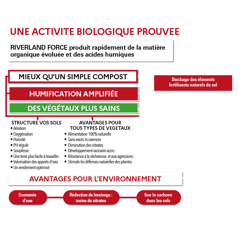 Riverland Force est un fertilisant naturel unique par la spécificité de sa composition. Il garantit des apports nutritifs importants, le maintien de l’équilibre des sols, et la stimulation régulière des systèmes racinaires